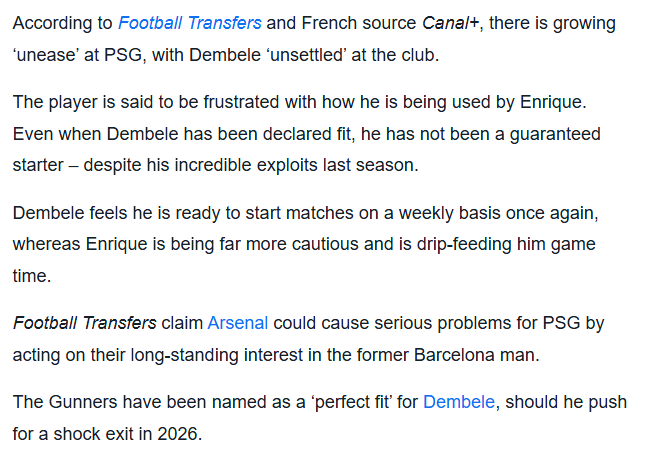 消息来源:https://www.footballtransfers.com/en/transfer-news/uk-premier-league/2025/12/arsenal-transfer-news-ousmane-dembele-possibility-emerges-as-unease-builds-at-psg