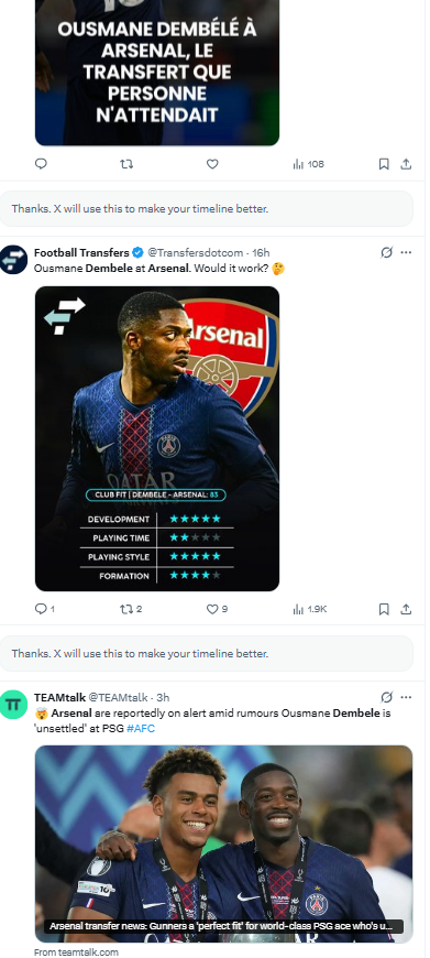 尽管近日在社交媒体X上出现了不少关于阿森纳与登贝莱的传言,但这些消息大多来源于Football Transfers的报道。笔者查阅了该媒体的原文,其内容更倾向于探讨“登贝莱适合阿森纳”这一可能性,而非明确断言“阿森纳对登贝莱有意”。